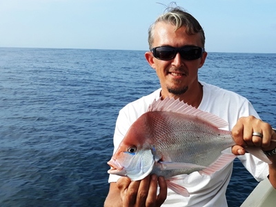 What stunning conditions, flat seas, light winds and sunny skies which made for an awesome day. The water is still dirty and there is debris around, temperature is under 21 deg.C. I found no signs of Tuna or Bonito and so we stopped and went for bottoms and really got some nice quality fish with some good sized Slinger, Copper Bream, Englishman and Soldier Bream. Once we had full quota of bottom fish for all on board we trolled back looking for a Tuna and I went inshore over certain points that have yielded us good Tuna in the past, sadly there was no sign, not even bait fish and we managed 1 frigate Tuna. Immediately after we went over the last point the shotgun snapped and the reel was screaming and in no time we were into the backing and could not stop this fish, to make a long story short after slowing the boat down more than normal and a hard 20 minute fight we managed to land a small yogurt bucket much to our surprise. It’s not every day that one can land their entire bucket list in 1 trip.
