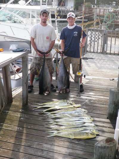 Some of the boats of the Beach Haven Charter Fishing Association have been making the long trek to the canyons and returning with some great stories. They have been making some fine catches of tuna, billfish, and mahi-mahi. Captain George Finck of "Sparetime Charters" took Dan Cronin and friends out to the canyon for tuna fishing. In addition to seeing plenty of whales and porpoises, they had five hits and boated a pair of yellowfin tuna to 65-pounds. On another trip he went to the canyon looking for tuna. He first boated two white marlin which he released. He then boated a pair of yellowfin tuna to 80-pounds, and finally five long fin tuna. Captain Lindsay Fuller had a busman's holiday on the "June Bug" and took out some of his mates and mechanics on a trip to the Lindenkohl Canyon. Art Barstow and Garrett Frey trolled on the "June Bug" before sunup with no luck and then at dawn moved into the deeper water. The first fish boated was a 75-pound yellowfin. During their trolling they picked up an 80-pound yellowfin and had a couple of white marlin which investigated the lines but did not bite. Then they found a 10-foot piece of barnacle encrusted wood that held a school of 10-pound mahi-mahi. Although the mahi would not bite on the trolled lines, they were able to catch as many mahi as they wanted using light spinning tackle with pieces of ballyhoo for bait. After catching all they wanted to eat, they spent time catching and releasing. Captain Lindsay says he feels this is the best year for tuna fishing in at least 20 years. The same two captains have had some inshore trips where they had to work hard through loads of small fluke to find some keepers. Captain George Finck had Leslie Nugent and her 12 year old son Cooper in the bay for fluke with one topping the scale at 3.5 pounds. On another bay trip he had the Glen Linhoff family out for a nice catch of fluke on his mother-in-law's birthday. Captain George had the Ross family out in the bay for fluke before getting chased in by thunderstorms. Once again fluke ruled the day plus a nice kingfish. For Captain Lindsay Fuller his inshore docket was made up of family reunions. The Potter family of Montreal, Canada, were out for a day's catch of over 50 short fluke, but no keepers. Another family trip with three children had great action once again on short fluke but keepers were hard to come by.
