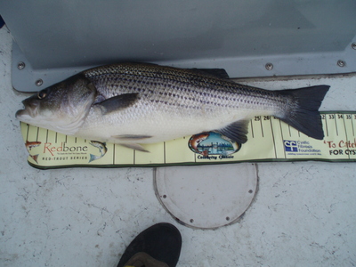 The sky began to clear and I continued to cast several different baits at pockets and at structure along the river. I kept working along and could not get another solid bite. So I decided to do some trolling. As I went along a extended point the bank side rod bent to the gunwale. "Ding-dang", I thought as I saw my line wrapped around that extended point. I quickly sprang into action thinking that there was another lost crank bait to the submerged cypress of the Cape Fear. Clearing the other trolling plug and starting to back up I noticed the line had some how moved about ten feet off the bank. As I put rod to hand that cypress snag had a solid head shake and felt rather hefty. I did not want to horse this one after talking to a friend of mine who in a similar situation a few years ago boated a 45-50 pound fish from the Cape Fear River. After a five minute battle on ten pound mono, I boated the 15 pounder. This is only my third fish over 30". The next two fish hit while cruising over some five foot flats. Although not great sized fish, Striped Bass none the less.