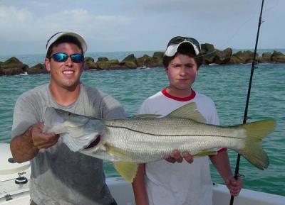 The next night was scheduled as a swordfish trip. With 20 knot winds I suggested a snook trip would be our only option. Away we went. Hitting the same spots as the night before produced next to nothing. We got a 7 pound snook and a couple barracuda. We finally caught another couple 5 to 7 pound snook and a 3 pound mangrove snapper. As darkness fell I decided to try one more very rough spot. It was so rough, that the Coast Guard got a report that we were floundering and in trouble. They dispatched a boat, but I heard the radio call and reported to them that we were just catching fish. As they returned to their other duties, we caught a 15 pound cubera snapper, a rare incidental catch, and a pair of 20 pound snook before going home. All these snook were caught in August and were released in good condition due to using circle hooks. Most were over the 34 inch maximum size limit and would have to be released during the open season. Again showing the value of using circle hooks with no offset so that every fish is lip hooked and will survive to keep the snook population healthy. I remember when snook populations were down to the point that it was no fun to fish for them. Please limit your catch and treat your release fish in a survivable way to help keep the population at these pleasant population levels.