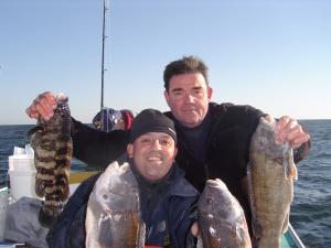 Open boat trip today with just 3 anglers . Fishing was very good we made 2 drops for the day and only needed to re adjust the boat a few times to produce 66 keepers with the guys just keeping there Limits. Capt. John had a banner day with 25 ,Timmy had 15 while Tommy and Tony each had their Limit. With only 3 anglers George even got to wet a line And had 6 . Mant quality fish in the 4 to 6 lb range with a few around 8lbs. Only a hand full of shorts and the endangered grey marines were not a problem today.