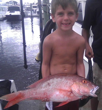 Often when we are fishing with the kites and the live baits we set a rod right on the bottom for Grouper or Mutton Snapper. As we float along watching those kite baits kicking on the surface we also pay a lot of attention to that deepest line. Smaller fish can quickly pick it clean and it must be frequently checked. We fish a long leader measuring from 15 to 30 feet of light monofilament and just enough weight to hold the bottom. When kite fishing that bottom line gets a live frisky pilchard or what we call a "plug" of Bally Hoo threaded onto a thin wire circle hook. Sometimes we use a freshly cut elongated chunk of something fresh and firm. Other than the Bally Hoo plug we use the same rig when targeting Muttons around wrecks. Muttons are opportunistic and will readily range off of the wrecks, so we catch a lot of them a bit off the structure. These are great fish to catch as they are powerful and determined in the fight and always all eyes are looking down and waiting for that tell tale pick color to appear as a fish comes into view and is brought to the surface. Pictured is young Mike with a husky Ft. Lauderdale Mutton Snapper that came off a shallow water wreck to eat a live pilchard.