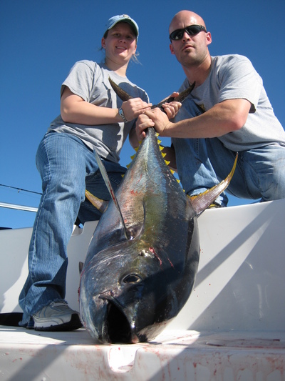 Friday's trip started out a little slow but would soon pick up. Spent most of the morning trolling for wahoo with no luck so decided to put a few grouper in the boat! I know that the spot we were in holds grouper, the only problem was the amberjack would hit the bait as fast as it could get down! We were using live mullet and Butterfly jigs, never a dull moment! We were able to catch a few blackfin, a limit of jacks and then the big one hit. Something big hit one of the jigs on spinning tackle but I could tell it was no AJ! After about 5 mins into the fight I could tell it was a Yellowfin and in 1 1/2 hours we stuck a gaff in an 80 pounder! What a fight on light tackle!