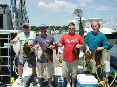 Today we had out Charles Vill and his brothers Robert and Chris and friends Joe and Chris Seifert for a day of fluke action. Well the fluke cooperated and the guys boated 18 keepers up to 23"s. If the drift didn't die we would have had a banner day. Fluke fishing is hot and we will target them on after work trip from 4-8 so if interested please call for pricing. And seabass fishing has been excellent and if interested we will sail for them as well. We run open boat during the week days if no scheduled charter is booked.