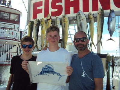 On our last two fishing charters, the Mahi Mahi action was fantastic, so I headed towards the east of Fort Lauderdale where there was a weed line in 500 ft. of water. As I hit the weed line, immediately all riggers came down. Four Mahi Mahi’s on! The whole family jumped into action and brought in the four Mahi Mahi’s – all decent sizes – 5-8 lbs. The action continued bringing in more Mahi Mahi’s. Black shadow on the teaser – Sailfish! Mark, our mate, dropped a Ballyhoo back to the Sailfish. Hooked up – Sailfish on – Marcus was our angler and jumped into the fighting chair to do battle. The Sailfish put on a fantastic show for us, doing a 360 ° jump and tail-walking across the sparkling blue water. After a 20 minute battle, Marcus had the Sailfish at the side of the boat. Pictures were taken, hook was removed and the Sailfish was released to fight again. Great job, Marcus - his hands were trembling from the strenuous effort.