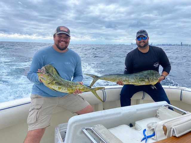 The mate started putting the lines in the water as soon as we reached the blue water in 100 feet. I continued trolling offshore and noticed a floating object surrounded by weed, and of course, trolled the baits past the float. As soon as we passed the area, the rigger line came crashing down, and we had a Mahi Mahi jumping out of the water. It’s always exciting to see the green of the Mahi, as well as the size of the fish - the bigger they are, the harder they fight, and this one was a good one. After a strong fight, the fish was alongside the boat, and the first mate gaffed the fish. I made a turn coming back to the area, and we hooked up to another Mahi Mahi. After another great battle, the fish was gaffed and into the fish box.