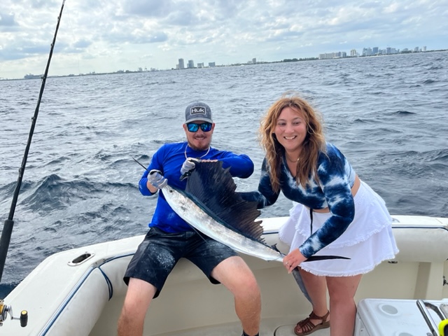 So now back to fishing in Fort Lauderdale. I could see an edge forming in 200 feet of water where the current and water color slightly changed. We trolled the spread of baits along the edge, and it didn’t take long before we had a Sailfish up in the spread. The bill of the Sailfish was behind the bait and feeding on the Ballyhoo. The first mate fed the Sailfish, giving him some line then coming tight to hook up the fish. The Sail ran with determination and jumped out of the water multiple times. After an awesome battle, the angler was able to raise the fish up alongside the boat for a quick picture and safe release back into the water. We resumed trolling the edge in 200 feet of water, and shortly after we had the full spread of baits in the water, we had another Sailfish up in the spread. This Sailfish hit a few baits then we hooked him up and the Sailfish started jumping. The angler did a great job angling the Sailfish to the boat. We quickly removed the hooks and released the Sailfish back into the water.