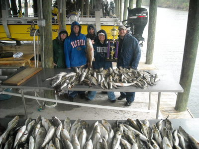 Tough fishing conditions Monday and Tuesday but not for the CHICAGO GANG Justin, Shana, Brittney, Kevin, Adam, and Nick they did not care about the wind and rain and were determined to fish. Well fish we did and had two outstanding days with limits of speckled trout and some nice reds and drums mixed in. On the second day, Tuesday the crew had a little competition among them selves and Justin even had trophies made for the winners. Well the weather was terrible raining and blowing from the start but on with the Tourney. Both boats limed on trout but we needed some reds for the big fish. Shanna struck a 27" bull red on the last cast of the day in the pouring rain to take the title of biggest fish and most fish caught per person. Everyone had great time and the Gang went back to Chicago with a load of fillets. Great group this was there third trip this year and they are already planning another for the spring. Thanks to Capt Nathan for helping out with this group in some tough conditions.