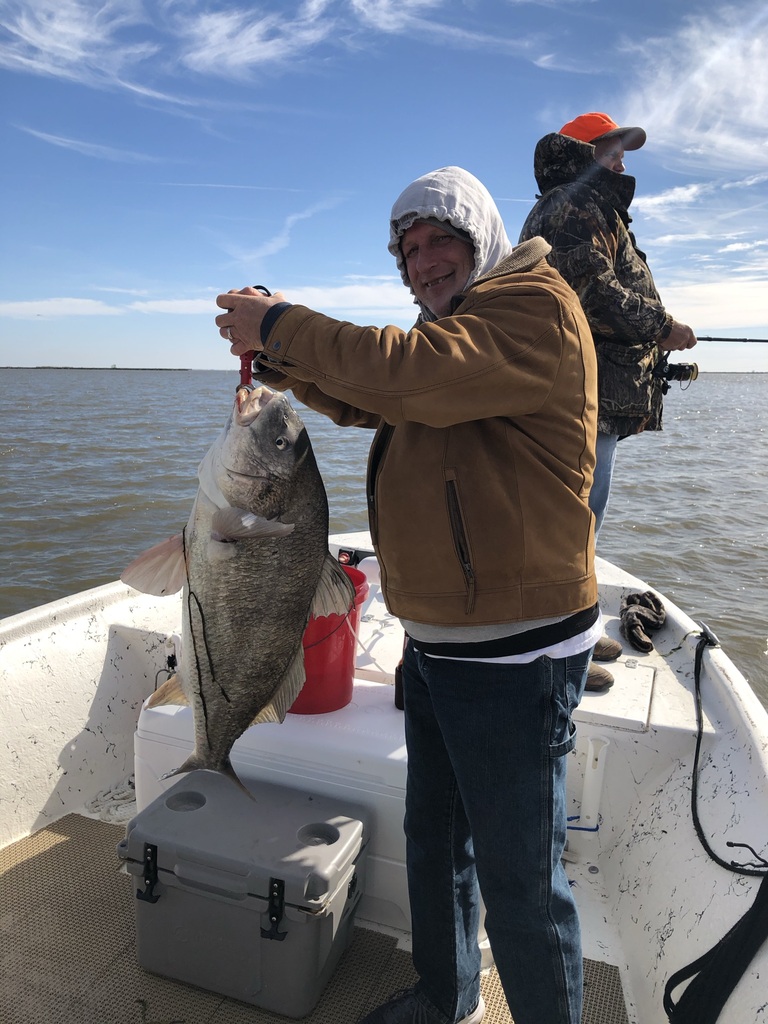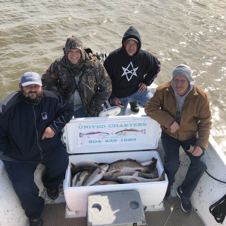 Chilly Saturday in Shell Beach. I picked up Billy Martinez, Paul, Bradley, and Kelly at Billy’s camp, the Bayou Slam Camp in Hopedale. We started out looking for some trout, but the wind and cold water had them with lock jaw. We switched gears and made a couple moves looking for some reds. We got on a steady bite and the Gus had a blast limiting on on some stud redfish, with a few bass and a flounder.