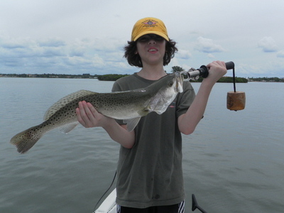 August 2011 fishing report. Hello Everyone. This summer has been very hot with water temperatures as high as 89 degrees. Redfish has been my most targeted fish with a few Snook mixed in. Redfish are easier to find at during lower tides as they are forced off the flats into the deeper holes and troughs. Tarpon have been busting bait all along the beach from Clearwater to Indian Rocks. Tarpon are also moving into the backwaters of Tampa Bay after their spawn in July. I would suggest free lining Tread-fin Herring or Pinfish down current where Tarpon are seen rolling. While Tarpon fishing be ready to tussle with a few large Black tip sharks. On July 26th. Josh landed a large 27in. Spotted Sea Trout on a cut Pinfish head drifted with the current. Not a bad catch considering the hot summer time water. If you are visiting the Tampa Bay or Clearwater Beach area this August try your fishing skills against a large beach cruising Tarpon or Shark.