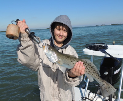 January 15, 2013 - Spotted Sea Trout remains my main target fish through-out January. The shallow grass flats from Clearwater north to Tarpon Springs have been abundant with Speckled Trout this month. My favorite artificial bait has been the Mister Twister Exude Dart or Gulp's three inch shrimp on 1/8th. oz. Mission jigs. Although trout love live shrimp, you can out fish someone using shrimp with one of these jigs. You can cover more water and find more fish fan casting as you slowly drift the near shore flats. Keep your retrieve slow so that the jig stays near the bottom. A slight twitch with the rod tip while maintaining a slow steady retrieve should do the job. Speckled Trout is my favorite inshore fish to take home for a fish fry. CJ (pictured here) landed his first Spotted Sea Trout on a Gulp artificial shrimp.