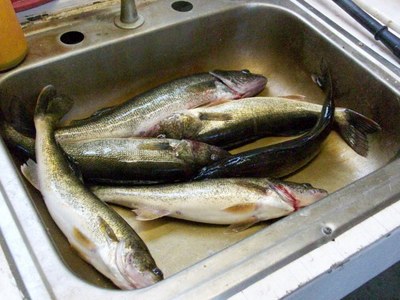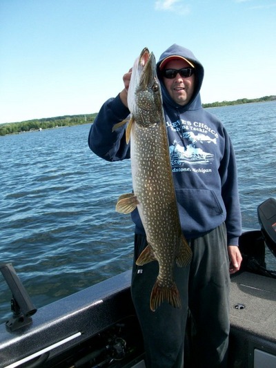 I fished with a couple of great guys the last two days, Mike and Ken from the Chicago area. Unfortunately, they got to see just what a cold front and strong west winds do to the fishing out here. Yesterday was the first day after the front and we started out pitching jigs again, but I could tell right away that the bite was not "on". By 6:30 a.m. the west wind was blowing strong and boat control was pretty much non-existent. We ended up doing some drifting along a weedline and picked up a few fish that way, ending the day with 6 keepers and a few undersized fish. Today was a different story...we woke up to 45 degrees and the flags were sticking straight out again! We picked up two keepers on our first drift, but the second drift produced nothing, so we made the switch to casting spinnerbaits for pike. We hit all my favorit places in the upper bay and a couple south of Gladstone, but even the pike were only following today. We did manage one about 30 inches that we kept and released one fat mama about 35 or 36 inches. The sun was out all day today, but the water temperature still dropped a degree from yesterday. That's what a strong west, northwest wind does here. The warm water gets blown out and the cold water comes in...making fishing tough to say the least. I hope the wind switches around or the next three days could be tough. We'll post our results....good or bad. Here's a couple of pics from the past two days, good luck from all of us in the Bay de Noc area.