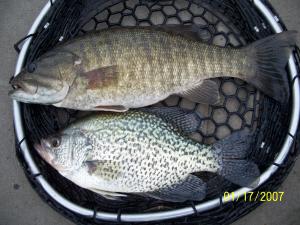 I had a hankering for fresh fish and needed to write a report so I hooked the boat to the truck and hit the lake yesterday for a few hours. The air was a bit nippy, but I found the fish fairly agreeable. I caught 8 keeper (10") Crappie, quite a few shorts, 3 nice (2.5 to 3 LB) Smallmouth, 2 Spotted Bass, 1 Largemouth, and at least a dozen Yellow Bass. I caught everything on a blue-green 3/32oz hair jig, fished with 4LB test on a 7ft Ultra Light St. Croix rod. Believe me….those Smallmouth gave quite a tussle on light gear. Julie (my wife) and I agreed that we had never eaten better fish than those cold water Crappie.