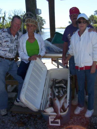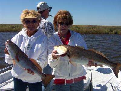 Bernie and Beverly and Boob and Sue had another super trip Saturday. We were scheduled for Friday but pushed the trip back because of a cold front blowing in and things worked out perfect. We got right to work on the trout at out 3rd stop, live shrimp under corks steady action for awhile then things slowed. On the move we fished some birds but the fish were tiny. Found the trout in a shallow cove out of the wind and eager to take our baits, live shrimp and Old Bayside plastic Shrimp in glow under a cork. The action heated up to a fish on every cast for awhile and the box filling up fast. Bernie said he wanted to get the girls hooked up on some line stretching reds so we left the trout to search out the reds. Two stops later and the drags were running. Everyone got into the redfish action after popping few lines and putting 7 in the box we called it a day. Beautiful fall weather and great fishing action, the fall fishing is now in full swing.