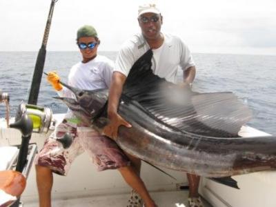 Captain Bill on the "Sailfish" went 16 for 22 on Sailfish and had 5 Sailfish and a Dorado hooked up at the same time…a sixer? This is a photo of Steve's MONSTER Sailfish. Captain Bill says 11 foot long and over 180 pounds…and Bill would know.