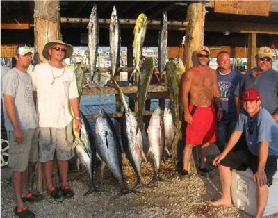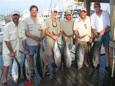 I think he had 8 and a few bull dolphin but I am not sure as he was dumping fish as I pulled in at 545..Nonstop tuna action for all of us while we were doing it..wasnt too crowded today..on my boat we picked up a fish on every drift sometimes two..skipjacks were hitting the poppers, yellows and blacks on live bait and nothing but yellows in the slick when we chummed..final take was 7 yellowfin, we tagged two and kept 5, along with 2 blackfins..we quit tuna fishing about 130pm and trolled the rest of the day finding one dlophin and missing 2 other bites one of which we think was a small billfish..Hunter had a white marlin on and off and on and off again..it hit a livey ran for 100 yards and dropped it, swam back and picked up the other bait..they got a few jumps out of it nonetheless..he ended up quiting on the tuna mid day after 5 fish then picked up 3 wahoo and 4 dolphin on the troll..he was fishing the hot end of the rip..