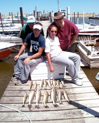 Wow, has the fishing been great this year so far or what? Even bad days produce some fish and the sizes have stayed just above that keeper level. Cranks and spoons are taking there fair share, but the harnesses with BB baited with the real deal on them are taking bigger numbers for sure. I've tried to get away from the real crawlers somewhat and started using Gulp this year more and more. Some days they work better then real bait, others no so good. I know I personally like knowing that my bait is still there after a few short strikes, and that if using real crawlers would have picked the hooks clean. But it's as much a confidence choice as any thing a man chooses to use. A recent cold front that moved through on Friday 6-22-07 put the fish off their feed a bit when we fished today 6-23-07. But we did manage to box a few decent fish for the half day trip. I'm also including a few other trips before this one for your viewing pleasure. Still got quit a few July charter dates left. As always, be safe, fiish smart and tight lines. Capt: Dan Manyen.