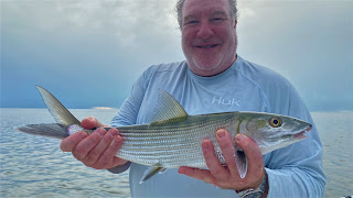Remember my last trip yesterday? Well, this one was similar. See, today I had Mark from D.C. and the last time we fished we targeted bonefish, tarpon, permit and we drew a blank. I kind of had forgotten about that until Mark reminded me. Ouch! :) Anyway, we headed off to hunt permit and bonefish. It was glass calm, nice and cool but with storms all around us so we got to work. I only saw two schools of permit after about an hour so we changed it up and went bonefishing. This is when everything changed. On the first cast Mark hooks and lands a 6lb bonefish. Whew!!! Pressure is off! But then we loose four consecutive bonefish and it's so frustrating. Ha, but then the we righted the ship and Mark ended up going 6 for 10 on bonefish! Dang Mark! We wrapped it up throwing lures at snook without success. Ok, I fell better now.