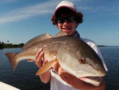 During a recent trip I had the opportunity to fish Larry and Rob Wolcott. We spent the early morning hours trying to sight fish some of these large schooling Redfish using both Shrimp and Jigs. After spending about an hour watching these fish basically swim over and around our rigs we made the decision to anchor way off of some of these schools and throw spoons to the WAVE (That's right a wave of fish!) of fish as they swam down the shore line. For those of you that may not be aware of the situation Spoons can be casted a mile and only need a basic retrieve to be successful. Our first attempt at this technique proved unsuccessful as we both panicked and hit 2 of the lead fish on the head (it's a wonder we didn't give those 2 fish concussions). But the second go was a success as Rob landed his Spoon at a great intercept point and was rewarded with his first and biggest Redfish to date.
