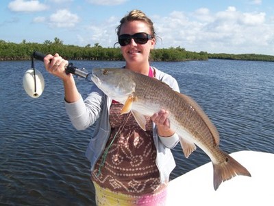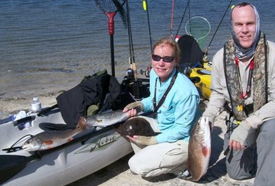 Kayak fishing is also beginning to heat up!!! Just ask Jane and Van Sayler who spent a recent morning with me and were rewarded with some great Redfish, Speckled Trout and Flounder Action. The morning started off with a great Topwater Speckled Trout bite in water ankle deep or only where kayaks could float. Walk-the-Dog style of lures worked best but there were plenty of fish willing to take a stab at Berkley Gulp! Jerkbait. After sliding a few of these toothy fish over their kayaks we decided to make our way towards some of the areas best Redfish grounds. As the warm Florida sun finally rose above the mangroves and tall palms, tailing Redfish became more prevalent on some of the skinnier flats scattered across the Salt River area. I did my best to position Jane and Van in some areas where Redfish were working but they could not have prepared themselves for the action that was coming up next. Upon coming up to a little island we noticed tons of mullet jumping and fining as the full moon tide made its way out. Every once in a while a bigger tail was spotted glistening in sunlight. The first two shrimp that hit the water were immediately donated to pinfish for the cause. However, the next two shrimp were destined for the Reds. Wham! Van hooked up! Wham! Jane was hooked up! Redfish double header on kayaks. Life is Good!!!!!! Throughout the rest of the day there were plenty of Reds, Speckled Trout and Flounder caught but none were more special than the two Reds that were involved in the double of the day!!!!!!
