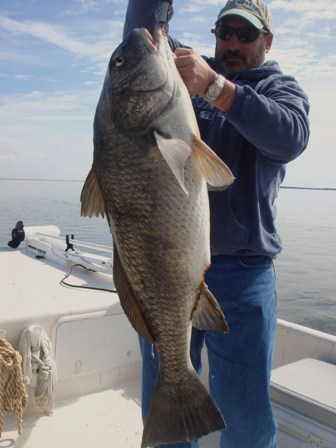There are tons of different ways to catch these Massive Pre-Spawn Black Drum but using a live shrimp, cut oyster, or blue crab usually will get the bite first. Recently my clients and I have also been throwing tons of fly patterns at them as well. Anything resembling a small shrimp or crab has got the most looks. A Merkin or Kwan fly with plenty of weight seems to be tops when targeting these hungry GIANTS!! With these fish pushing 20-60lbs don't find yourself under prepared. A good spinning rod with plenty of backbone and a 4000 series reel that will hold plenty of line is tops on the list. And you definitely do not want to be caught with anything lighter than a 9wt fly rod when targeting these bruisers. Because the water is so shallow, 1-2ft of water in most cases, these fish are obviously not going to do much sounding. However, a Black Drum pushing 40+ pounds will give any angler the fishing fight he/she has been looking for!!