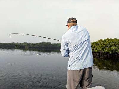 From the very moment we shoved off the dock, the day had a sweat smell of success to it. Our early morning run through Salt River consisted of driving through heavy fog but as we rounded every mangrove point heading south the fog began to give way to sparse glimmers of sunshine poking through the sky. Turn after turn brought upon more excitement and anticipation. After coming off of plane in a small mangrove laden lagoon it became very apparent where our day headed. Upon immediately taking the poling platform it didn’t take more than 2 minutes before our first Redfish tail was spotted. 2 casts later with a Dupre spoon fly Chap was hooked up and landed our first over sized Redfish on the day.