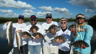 Sheepshead provide great sport for a variety of reasons. First, they are usually very cautious and constant nibblers. Most Nature Coast Fishing Guides know that a multitude of tactics will be needed to trick these wary fish. Free-lining both live and dead shrimp and crabs to the bottom at varying depths are all part of this equation. On "good" days, fish will be careless and respond to any and all baits that hit the water. Other days these fish just seem to swim and sample your baits making for a frustrating day. Aggressive chumming is a standard requirement for getting these fish in a biting mood. The second reason that these fish are great sport is that they pull like crazy and seek structure. Using medium action spinning rods, a 4lb Sheepshead will give most anglers all they want.