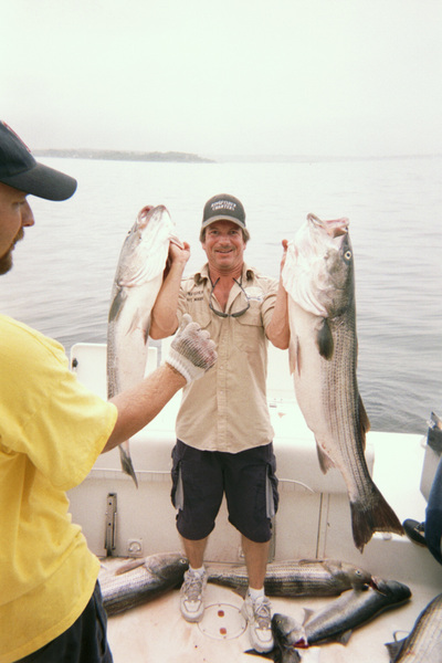 Friday afternoon Robert Brazili's group scored big on diamond jigs in the Race with a limit of stripers between 28inches and 35inches along with a 40lb. 45 inch striper caught on a leftover live bunker from the previous trip.
