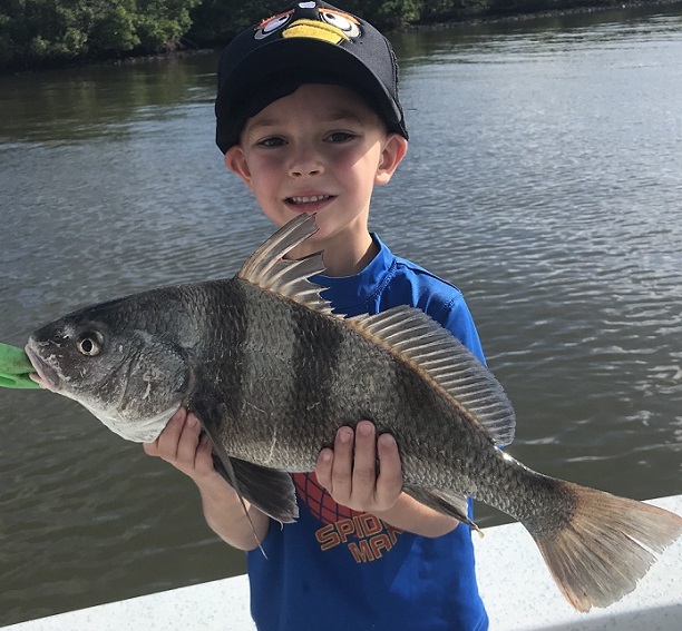 Autumn 2019 has arrived, we’ve had plenty of east winds off the ocean, cooling us down just a little bit , as early fall is still fairly warm here in East Central Florida, the east winds raise water levels in the Intracoastal Waterway and saltwater Mosquito Lagoon by pushing more ocean water inside the near by Ponce De Leon Inlet and filling the estuary with clean seawater, also beginning the process of clearing the water clarity after the usual cloudy water of summer. Schooling inshore game fish as coming through the region as well as the fall migration of baitfish, surface striking Jack Crevalle, Bluefish and Ladyfish are great fun for sight fishing, casting bait or lures right into the white water surface action can bring instant hook ups and great rod bending with drag pulling. Also the usual Seatrout, Mangrove Snapper, Whiting, and others are abundant here in the backwaters, Snook, Black Drum and Redfish and others are also always a possibility. Family friendly trips with children are one of my regular types of charters, is great fun putting everyone on catching fish, but kids catching a good one is always a treat. Young Frankie from Orlando had a great battle catching a nice Black Drum on a back water creek…………….