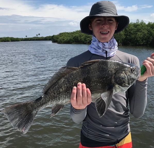 Long awaited cooler weather has come to East Central Florida with the arrival of November, water temps finally lower after a long summer, the fall migration of fish has been moving through the area as they work their way south, schools of Jack Crevalle, Ladyfish and Bluefish, attacking the migratory finger mullet on the surface with white water strikes showing the way to sight casting hook ups with lures or bait and drag pulling bent rods. Water levels also beginning to drop after flood levels of late summer following much rainfall we have had this year. All the different species of our resident inshore saltwater fish are caught here in the north Mosquito Lagoon and Indian River at New Smyrna Beach, including Seatrout, Snook, Redfish, Sheepshead and more. Black Drum are a staple species in the holes, back creeks and channels, here is Noah from Orlando out with me on a recent trip which landed many different fish including a few good Drum ……………….
