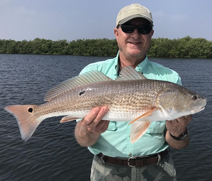 Florida winter is knocking at the door, cool fronts finally getting this far south, nice cool mornings, water temperatures creeping downward, with the prevailing north east winds in the fall, our intracoastal waterway is at flood levels with nice clean ocean water filtering in for weeks now. Cool water fish as starting to appear on the hook, Sheepshead and Bluefish, rarely caught in summer are usual catches during the cool half of the year. Mosquito Lagoon seagrass beds have been regrowing themselves after an absence of several years following chronic algae blooms of years past, giving a better opportunity again for grass flat sight fishing primarily for Redfish and Seatrout. On a recent scouting trip onto the Lagoon grass flats we caught a few Redfish, here me with the best one close to 30” before photo and release ……………