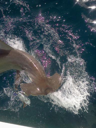 It was now time to do some Shark fishing so I headed out to the Shark grounds located in 350 ft. of water in Fort Lauderdale. I started out with one surface Shark bait, one midrange and one bottom. The wait was not long. We got hooked up on the midrange bait as the line from the 80 International Reel exited at a fast pace. Braden with enormous enthusiasm was our angler as he hopped into the fighting chair to do battle. The tug of war went on for forty minutes, and Braden was rewarded with a 94 inch Hammerhead Shark. Pictures were taken of his catch, and the Shark was released to do battle again.