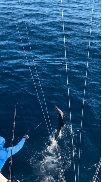 With a lively spread of six bullet Bonitas in the water, we set out to fish depths ranging from 100 to 300 feet. As we slowly trolled along, the first sign of action came in 150 feet of water. One of the live baits started darting erratically—a clear indication that something big was nearby. Within moments, a magnificent Sailfish charged the bait, its dorsal fin cutting through the water like a knife. Gina was up first.