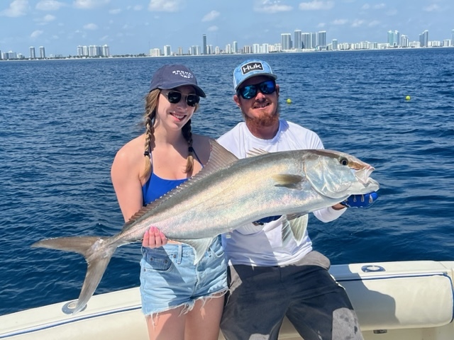 We started the day trolling in 200 ft. out to 300 feet of water in search of Black Fin Tuna. The Tunas were biting the day before, and I was hoping to get back on the bite. The current water color and bait have been ideal for the Tunas to feed, and we had similar conditions the day of the fishing charter. We fished with four surface rigger lines all scaled down in size for the Tuna, along with two deep planner lines. We were heading offshore, then back over the reef searching the depth sounder and looking for evidence of the Tunas. After no sign of life and not looking promising, we decided to change gears and fish a live bait on a sunken shipwreck. The first mate rigged a circle hook with a live bait bridle and a 20-foot leader to a lead. We sent the bait down to the wreck and made a drift over the structure. We had a knot of north current, which is a good amount of current for these fish to feed. After we passed the wreck on the first drift with no bites, I decided to fish on the deeper side of the wreck - slight adjustments make the biggest difference. On the second drop, the bait hit bottom, and shortly after reeling the bait off the bottom, the rod bent over, and we had one on. Bella, my angler, started reeling on the line, set the hook then started fighting the fish. She did great fighting the fish, and after a 15-minute fight, she brought up an Amberjack. We brought the Amberjack into the boat, removed the circle hook, and after a picture, released the AJ.
