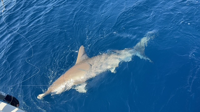 Finally, the Hammerhead came alongside the boat. An impressive sight up close—sleek, powerful, and still full of energy. We used a pair of bolt cutters to safely snip the hook in half, making sure the Shark swam off strong and unharmed.