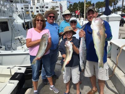 And so here comes yet another so/so report regarding our Deep Sea fishing charters here in Ft. Lauderdale. A good day of offshore fishing followed by a tough day that we have been mentioning in previous reports continues to be the case here. There have been days when fishing for Kings on the reef has been stone dead. Stone dead. And then we have caught or limit of Kings on two charters since our last report. A couple of Wahoo have joined us and we see Mahi-Mahi most every day of reasonable size but only a few. A few really nice throwback Groupers as the season remains closed for them. Chance for a nice Blackfin Tuna to bite you just off the edge. Sails around but very few. Good news is that our Golden Tilefish deep water spots continue to produce fish in a short time when we visit them. Big fatty for Mike and his crew in the picture(s) with this report, so every day isn't the "a bad day of fishing beats a good day at the office" line as there have been some good ones hitting the ice. That said we all do hope for more stable fishing this week.
