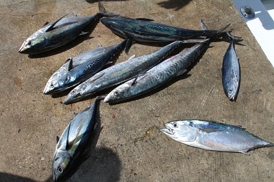 Captain JJ, and mate Mike, had Chris from Texas this morning on an 8 am‑12 pm trip. The trolling was productive as they caught a few Blackfin tunas and some bonito and kingfish.