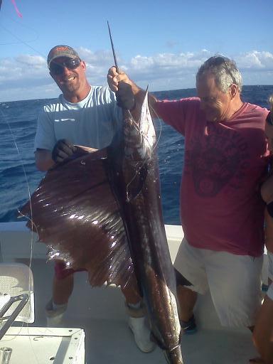 I headed to one of our 34 artificial wrecks located in Fort Lauderdale, ranging from 60 ft. of water out to 480 ft. consisting of 500 ft freighters to 30 ft. boats. I trolled from one wreck to the other looking to mark fish on the depth recorder and caught four Kingfish, two Mahi Mahi's and three Bonitos. There was a slight color change forming in 185 ft. of water. As I trolled south on the color change back to Fort Lauderdale, a black shadow appeared on the dredge teaser. Mark, our mate, pitched baited the Sailfish and immediately he faded off the teaser and ate the Ballyhoo. The fun began!!! This Atlantic Sailfish came out of the water, tail-walking away from the boat while the sun's rays hit his body, showing his brilliant blue and silver neon colors. Twenty-five minutes later Bob reeled in the Sailfish as Mark brought the fish to the boat for picture taking, to be released to fight again.
