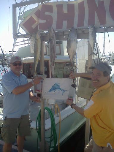 From there we reset the kite and Brian was our next angler up. Sailfish – left long kite – exiting the water as the sun reflected on his blue and silver neon colors. Twenty-five minutes later Brian brought the Sailfish to the boat and Mark, our mate, brought it in for picture taking and release. We set up the kite again and caught the following: Tuna, Mahi Mahi, Bonitos, and Kingfish.