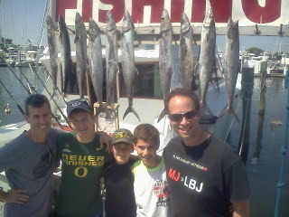 All three young fellows started calling, "here fishy, fishy" and waved their "magic rods". Soon one of the plainer rods had a fish on as Alex jumped into the fishing chair and was rewarded with an 8 lb. Kingfish. From there, all the young anglers kept rotating, taking turns catching fish, as the two fathers cheered on their sons, taking pictures and also taking turns. We made a drop and caught three Snappers. The total catch for the trip was 10 Kingfish and 3 Snappers.