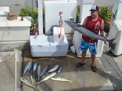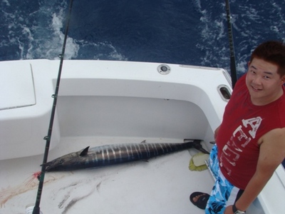 We started out trolling the reef with our two planners running down about 45 feet and three ballyhoos' skipping across the surface. It only took a couple of seconds for our first bite and Jaehyum (we called him John) to jump in the chair and in came our first king fish of the day. Then they started coming one after another. We ended up with our limit of kings quickly along with a few bonitos and barracudas thrown in.