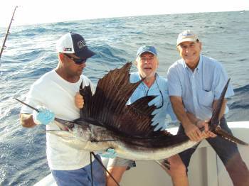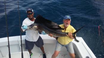 Dirk was on the plainer rod bringing in his Kingfish as the black shadow appeared on the right short. It was E.C.'s turn now. Hooked up!!! the Sailfish came out of the water and the fun began!!! The Sailfish immediately headed towards the east, gray-hounding away from the boat – this was E.C.'s first Sailfish. Dave, our mate, cleared the other lines while both anglers were hooked up. Dirk landed his Kingfish while E.C. was fighting his Sailfish. After a twenty-minute battle, Dave grabbed a hold of the leader, pictures were taken and the Sailfish was released.