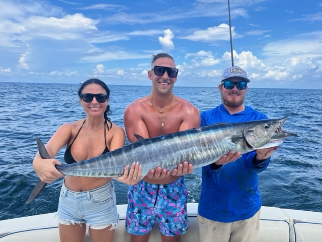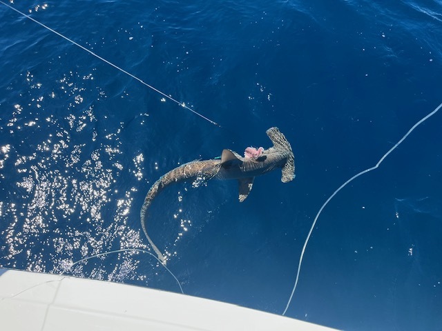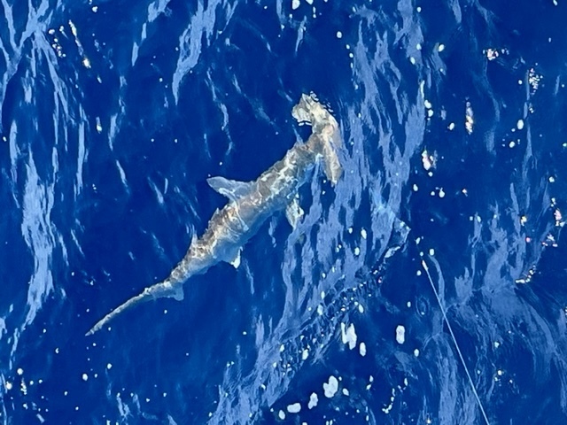 August 4th, Kendra, Henry, and Steve booked a half day afternoon charter. We started out trolling in deeper waters and had early success catching some Black Fin Tuna. These fish were outside the reef line and on a color change in 550 feet of water. We had birds crashing and schools of flying fish getting up and out of the water. Mixed in with the Black Fin Tuna were some medium and larger sized Bonitas. The group wanted to try for something larger, so we deployed the Shark baits. It didn’t take long before there was a dorsal fin circling the surface bait. He made a couple of passes before crashing on the bait. The rod bent over and started pulling drag. Kendra was the angler, and she did a great job. After an epic battle, she had the Hammerhead Shark alongside the boat. We were able to safely get circle hook out of the Sharks mouth, and after a couple of pictures, released the Shark. We put the trolling gear back in the water, and I fished along an edge. The deep planner line got a big strike and started ripping out drag. We could tell by how hard the fish hit that it was going to be a nice one. The mate had his gaff ready and from the deep we could see it was a Wahoo. Kyle, the first mate, took his shot and brought the Wahoo in the boat.