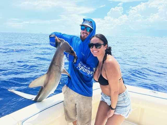On July 29th, James and Cici from Texas booked a half day fishing charter. We trolled the reef with a surface spread of baits and two deep planner lines and caught Bonita and King Mackerel. The last 45 minutes of the charter we fished one surface Shark bait and one bottom Shark bait; it did not take long before we hooked and caught a Dusky Shark.