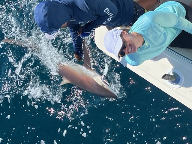 August 2nd, Andre and his two daughters from Michigan booked a half day fishing charter. We trolled the reef and caught King Mackerel and Bonita. We had caught live bait earlier in the trip and stopped over a sunken shipwreck fishing for an Amberjack or Grouper. The rod bent over, and we hooked a nice size Barracuda. After wreck fishing, we continued trolling in deeper waters and put out some Shark baits, one fished on the bottom and one on the surface. After the scent trail worked its way down the reef, a Hammerhead Shark zeroed in on the blood and hit the bait. After a good battle the Hammerhead Shark was brought alongside the boat, we removed the circle hook and released the Shark.