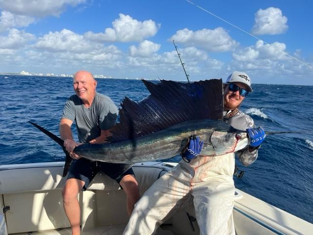 Rich and his group from Tampa chartered a 3/4-day trip. The easterly winds were blowing so we decided to kite fish with two kites and 4 live baits and a dead bottom bait. The conditions were right, and we were feeling very confident a Sailfish would find our live baits. It didn't take long before two Sailfish popped up. They both fed on the live baits and started swimming off. Our two anglers fed the Sails some line then came tight hooking the fish. It was a pretty epic battle - both fish screaming off line in different directions, jumping all over the ocean. One by one we got the fish alongside the boat, removed the hooks, and released the Sailfish.