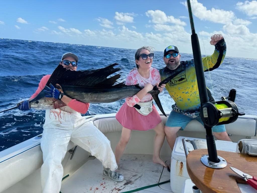 Anthony and his family booked a 3/4-day charter. First, we trolled the reef and caught King Mackerel, which were in 150 feet of water. Then we trolled down to a couple of sunken wreck structures. These sunken shipwrecks hold a lot of baitfish and in turn a variety of different species. Using a live bait, we sent a treble hook rig down to the wreck. It didn’t take long before we hooked a Barracuda. We headed out to a deeper part of the wreck, and using a heavier mono rig, hooked an Amberjack. After repeating the process, we hooked another 2 Amberjacks. These Amberjacks can weigh 30 to 60 pounds and make for a fun fight. Trolling a spread of dead baits back up the reef, we caught a Sailfish in 150 feet of water. After we removed the hook and took a quick picture, we released it back into the water.