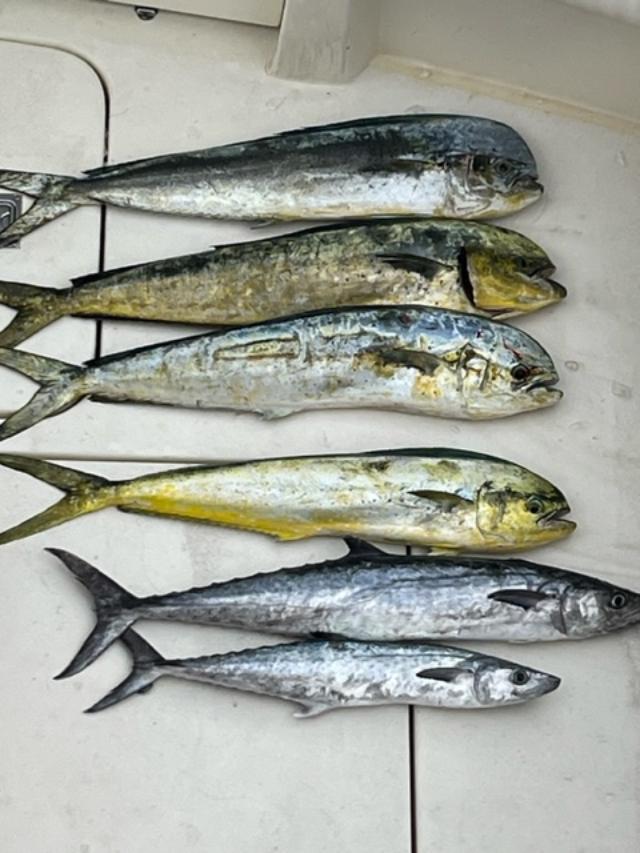 Matt booked us for a half day deep sea fishing charter. The Black Fin Tuna bite has not been that good over the last few months; however, we located them yesterday. We were fishing in 700 feet of water, and I could see some Tuna action on the surface - they will jump out of the water and crash on the fish they are feeding on. Trolling over the area, I was also marking them on the depth sounder, about 20-30 feet down. We got bites on the surface rigger lines and the deep planner lines and ended up catching 5 Tunas. Just a little deeper of where the Tunas were caught, there was some floating debris. We worked the area catching 4 Mahi Mahi’s (two were keepers) and one Wahoo.
