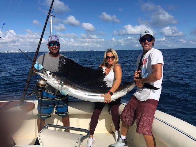 I ran down to the southern waters of Fort Lauderdale where fishing can be very productive and there is good reef and bottom structures, often having clean bodies of water moving through. The mate rigged up the spinners with light leader and circle hooks - we were also fishing a teaser, which is an artificial strip of hologram baits. I started fishing on the shallow side of the drop off. There are no fences in the ocean, and these fish will travel up in the shallow flats searching for Ballyhoo. The mate staggered the baits with one center shot gun bait, two long and two short baits and one positioned behind the strip teaser. The spread of baits looked killer - now we just needed a fish to come along. I slowly moved the baits along the reef and went from the top of the reef, along the drop off and out to deeper waters. The mate was continually changing out baits, as needed, as well as clearing them off of any weed. We recently had a cold front move across the state, and whenever we have a cold front, the Sailfish bite turns on. These fish are migrating south, and the front will move a body of fish through the Fort Lauderdale fishing grounds. Sometimes we will see the bite turn on the next day and at other times, it will take a few days.