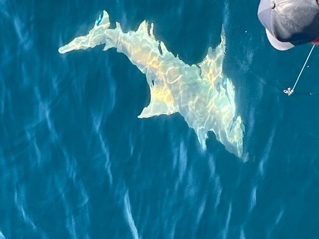 Just outside of the sunken shipwreck is a good area to target larger game fish. I positioned the boat facing into the current in 250’ of water, and the first mate set out 3 dead baits - one on the surface, the second in the mid depth around 125’ of water and the third bait right on the bottom. About 30 minutes into dead bait fishing, the bottom rod bent over, and line started peeling off the reel. Luis got strapped into the main fighting chair and started fighting this fish. It took around 45 minutes, and up came a Bull Shark. The first mate wired the remaining 20 feet of line, and we were able to get a couple of pictures, then cut the hook out of the Sharks mouth.